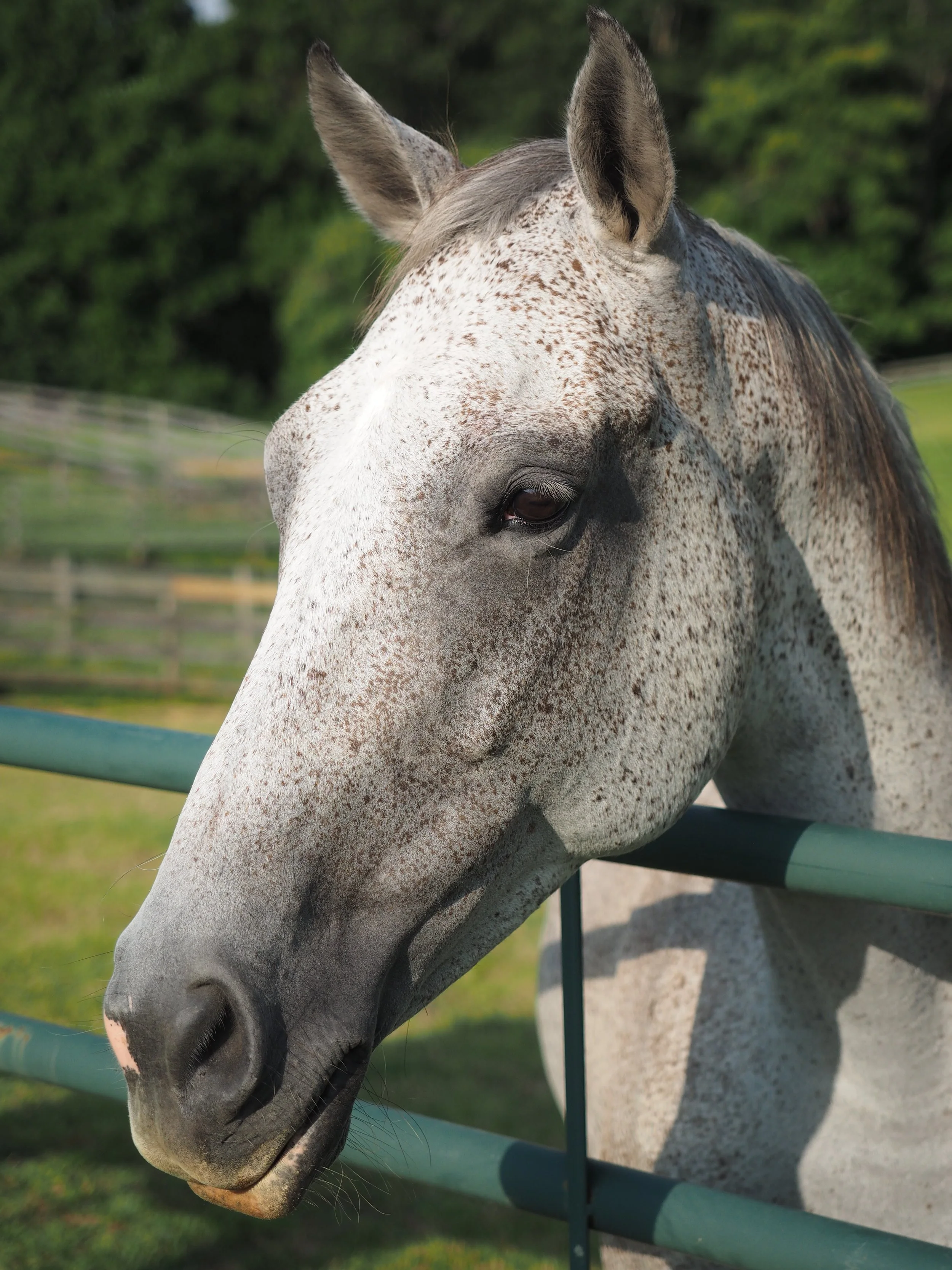 A stately gray Hanoverian, Pepper has a beautiful speckled coat and long blond tail. She loves hanging out with her friend Grape.